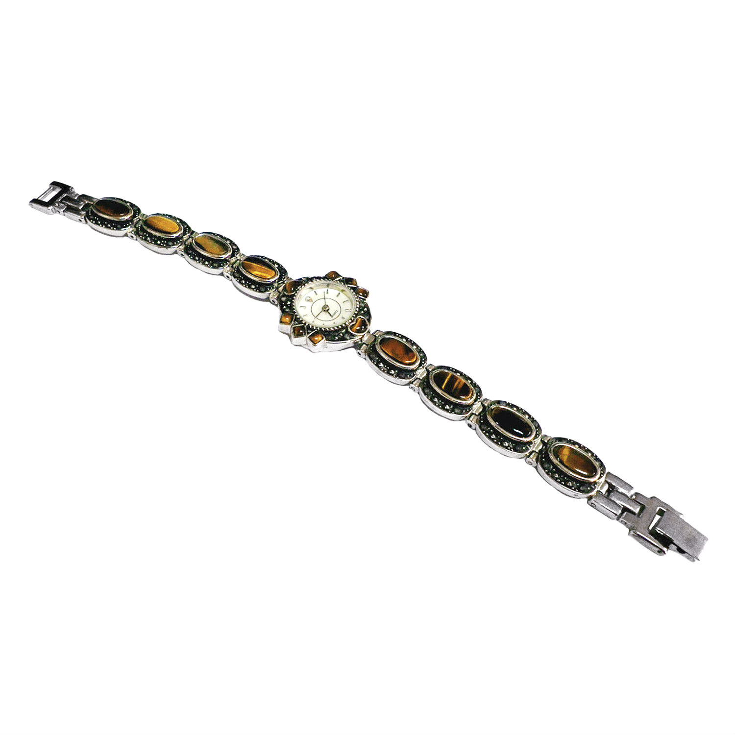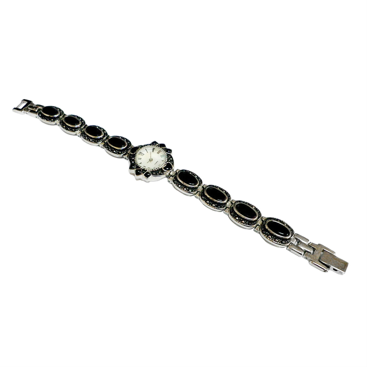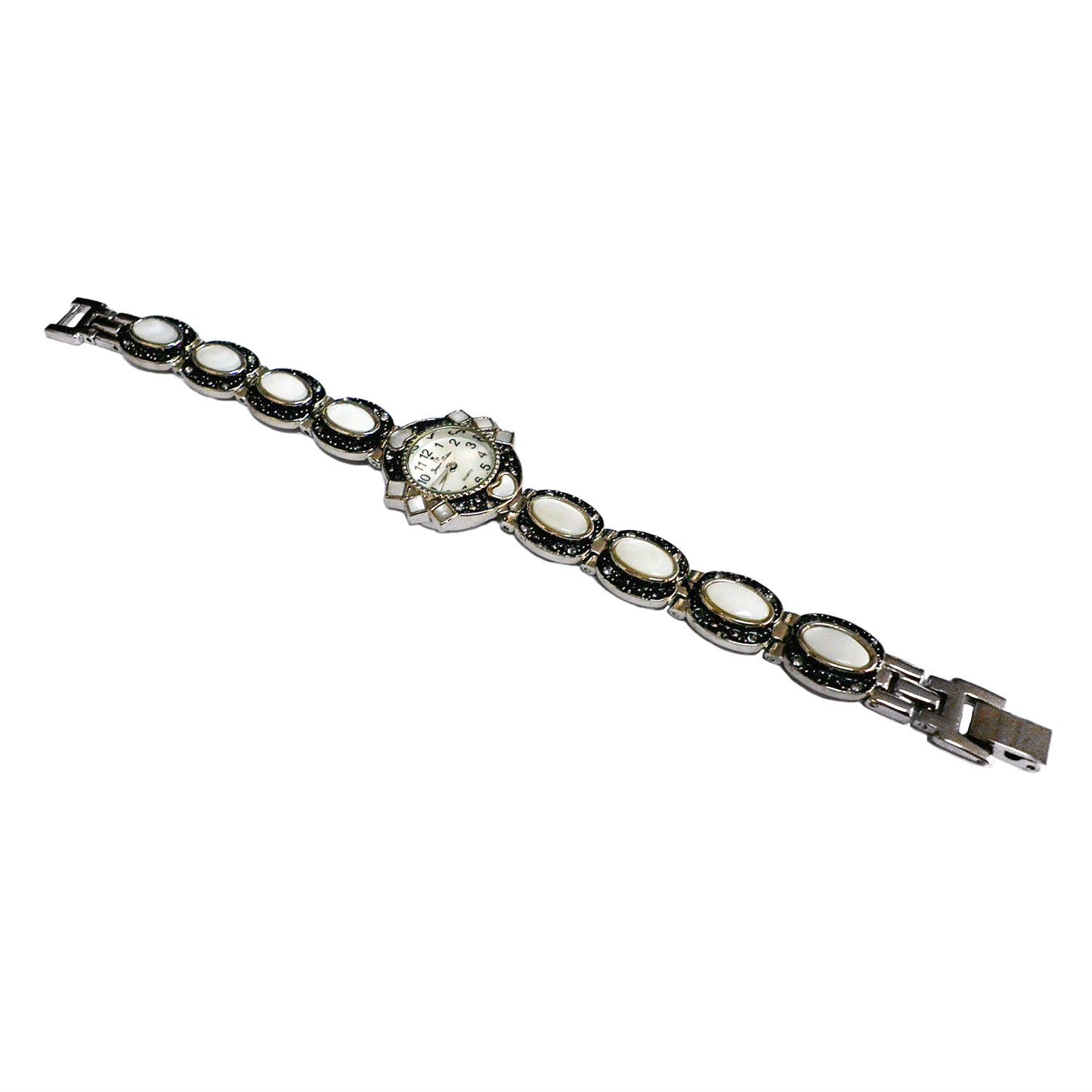 The featured ladies jewellery watch is decorated with white mother of pearl shell. It has a round watch case decorated with oval shaped stones on the bezel and has a white round dial with slim hands. This watch reflects a fashionable style with a black design and is excellent for matching a classy and elegant look.