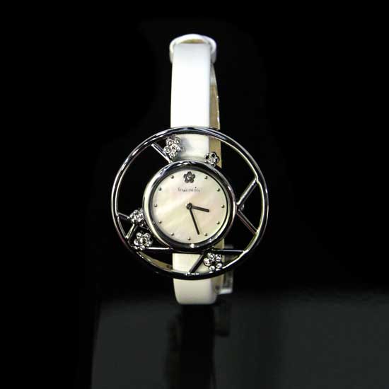 - White dial with stone markers and two hands.