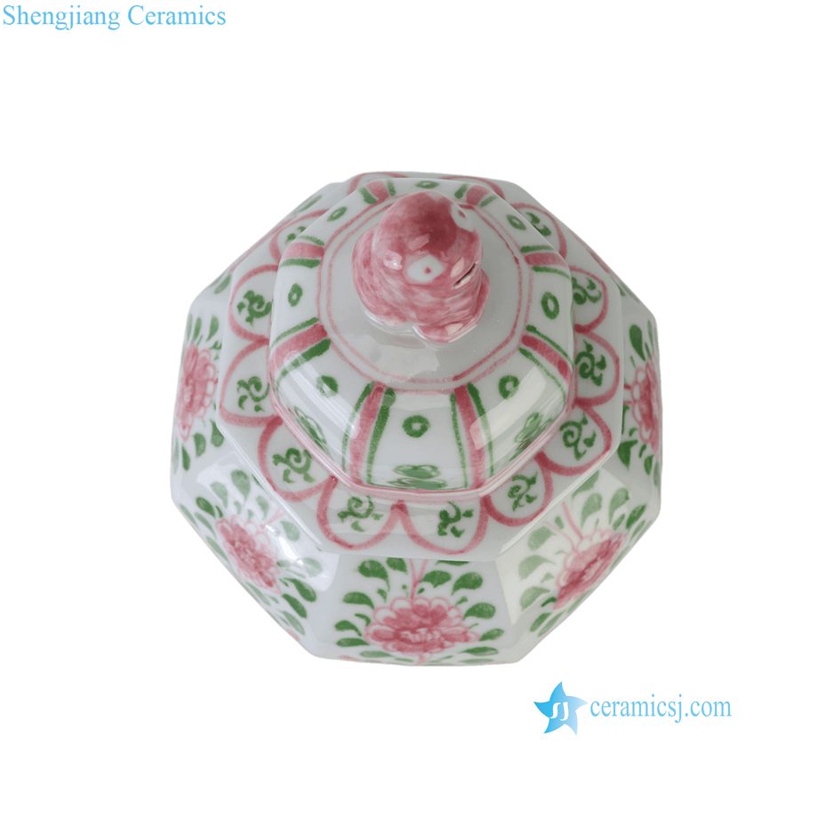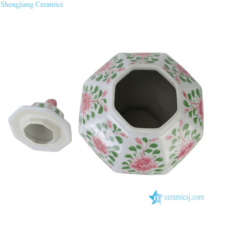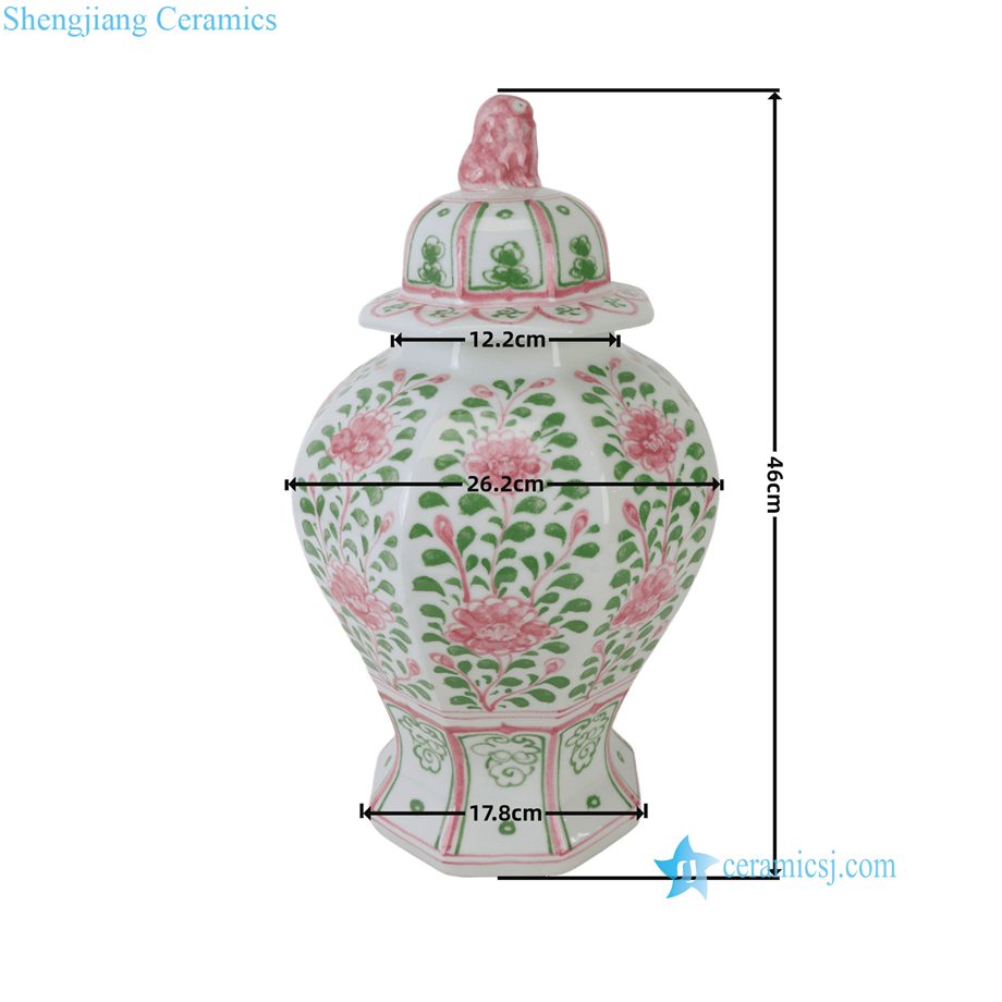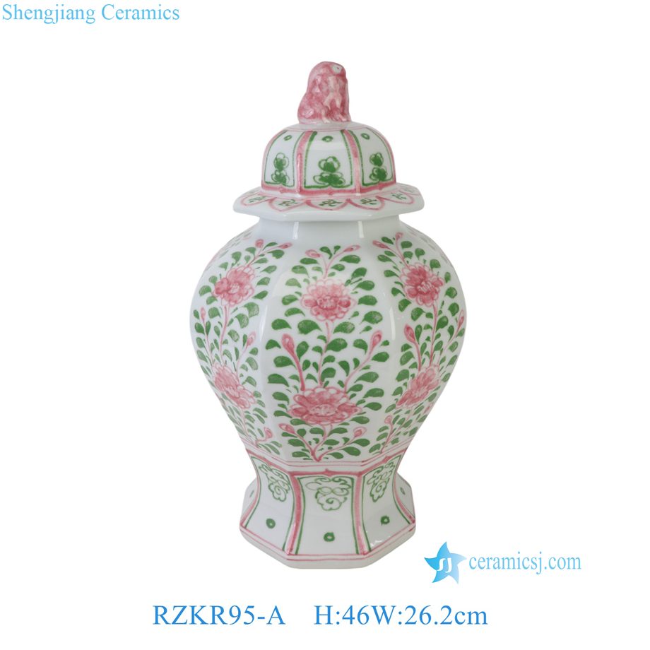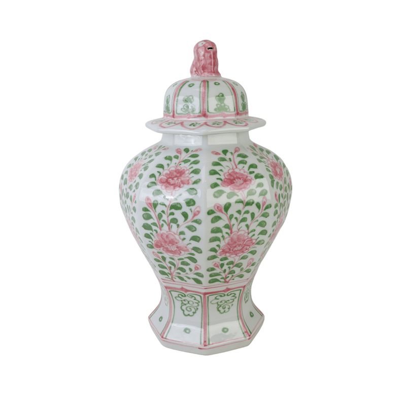 Pink & Green Floral Octagonal Ginger Jar with Foo Dog Finial