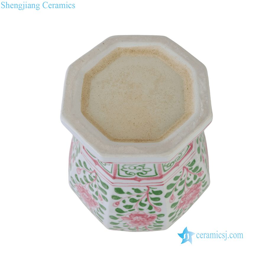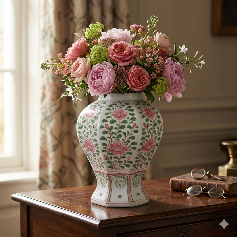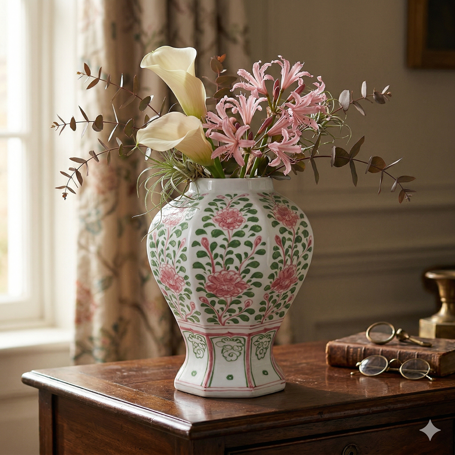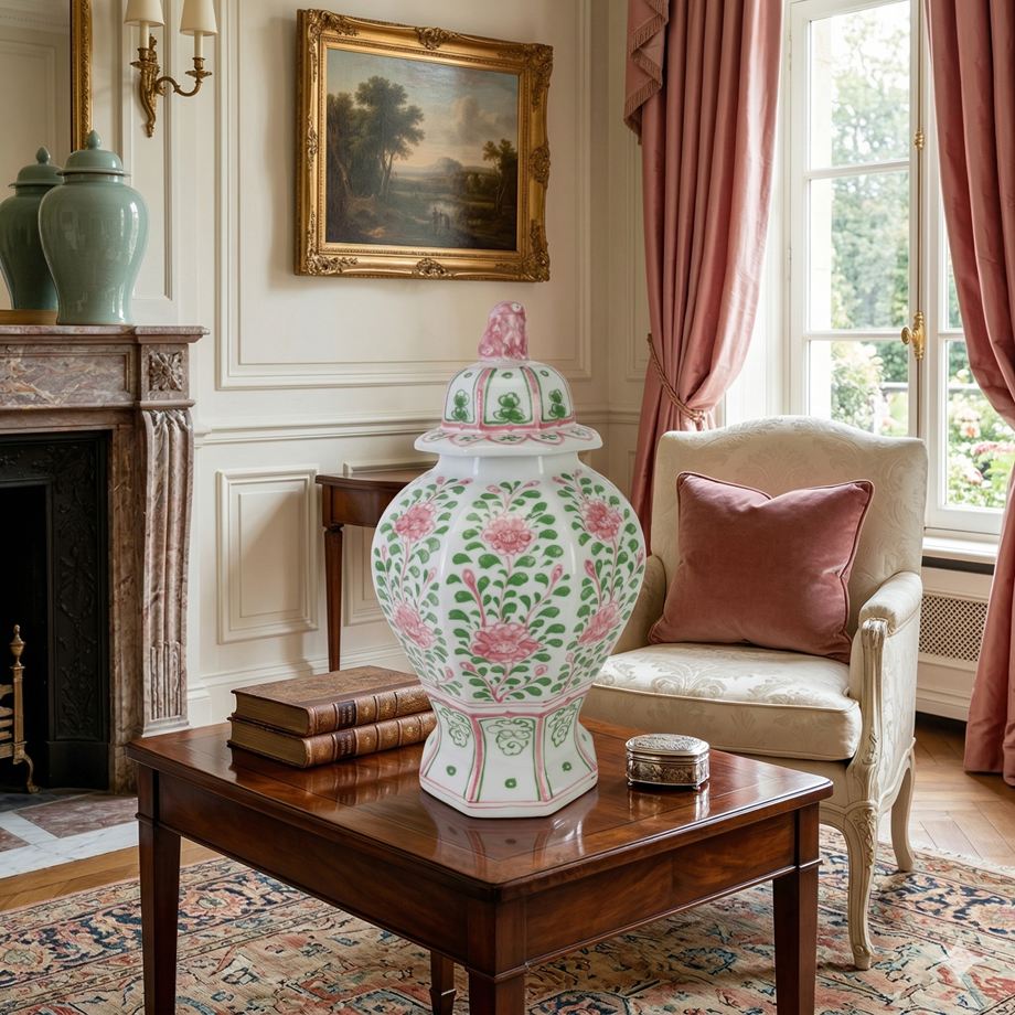 Pink & Green Floral Octagonal Ginger Jar with Foo Dog Finial