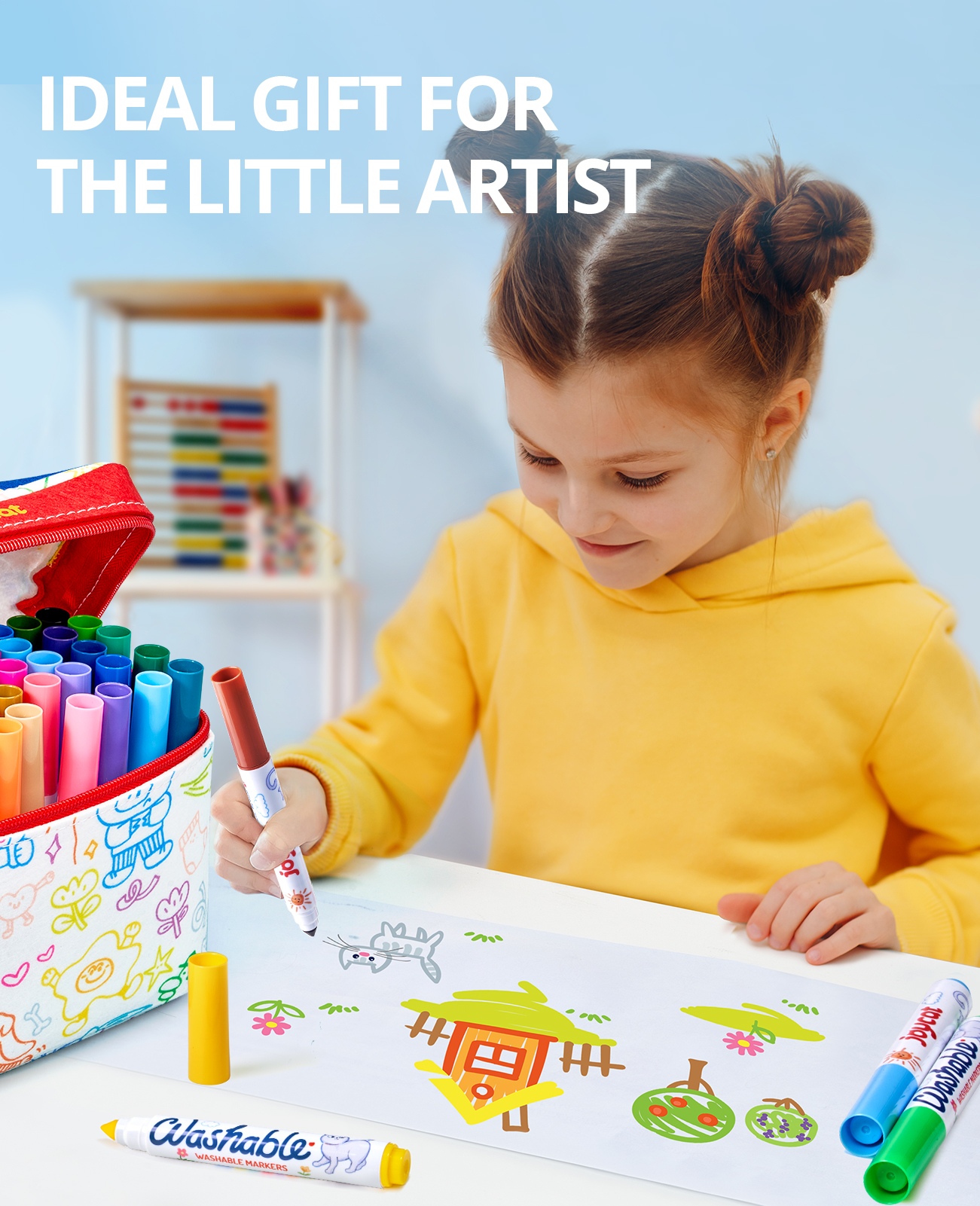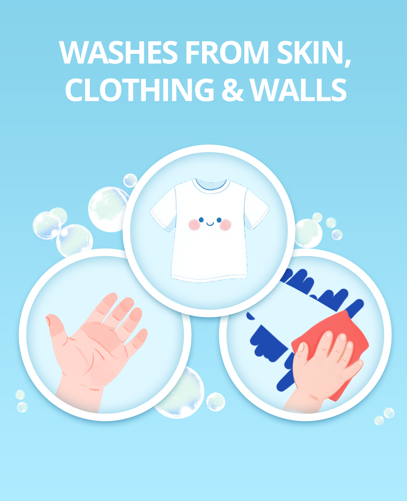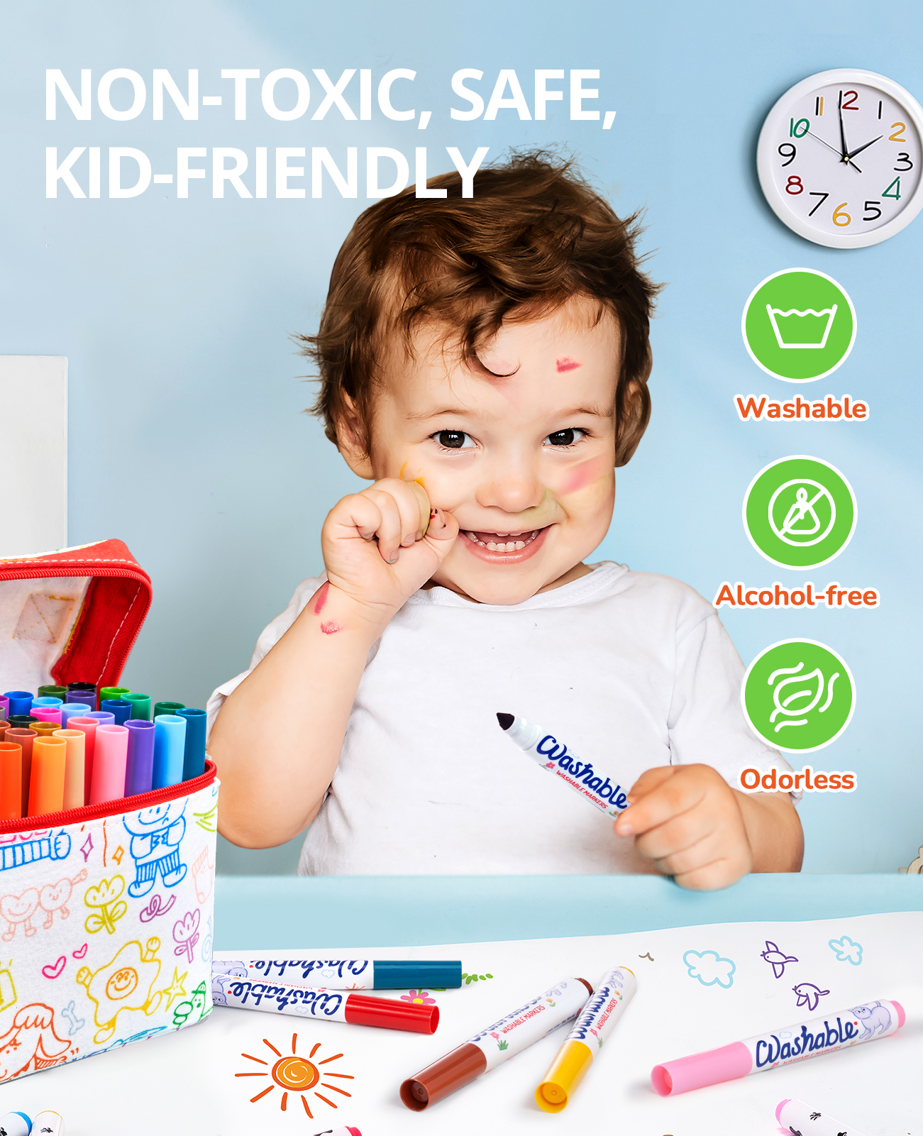 • 【NON-TOXIC & ULTRA WASHABLE】Certified non-toxic (meets ASTM-D4236) and safe for ages 3+. Stress-free clean-up! Ink washes off skin and most fabrics with water – no scrubbing needed! (Note: Not for whiteboards - may stain but wipes clean with a damp cloth)