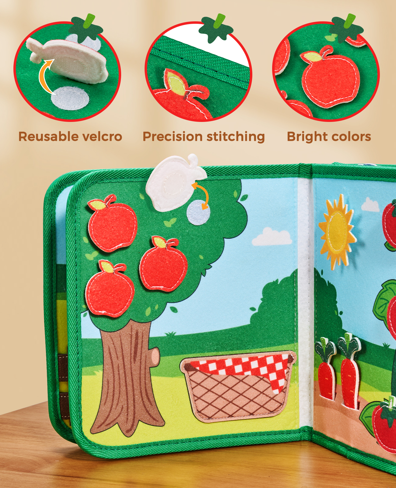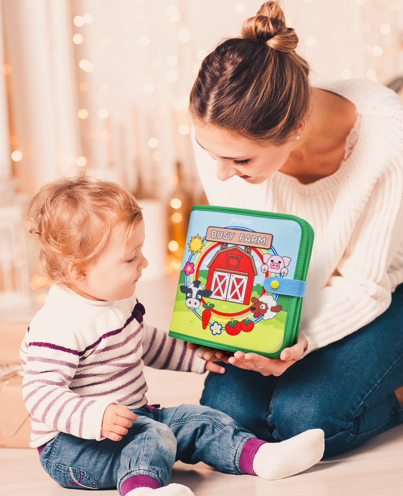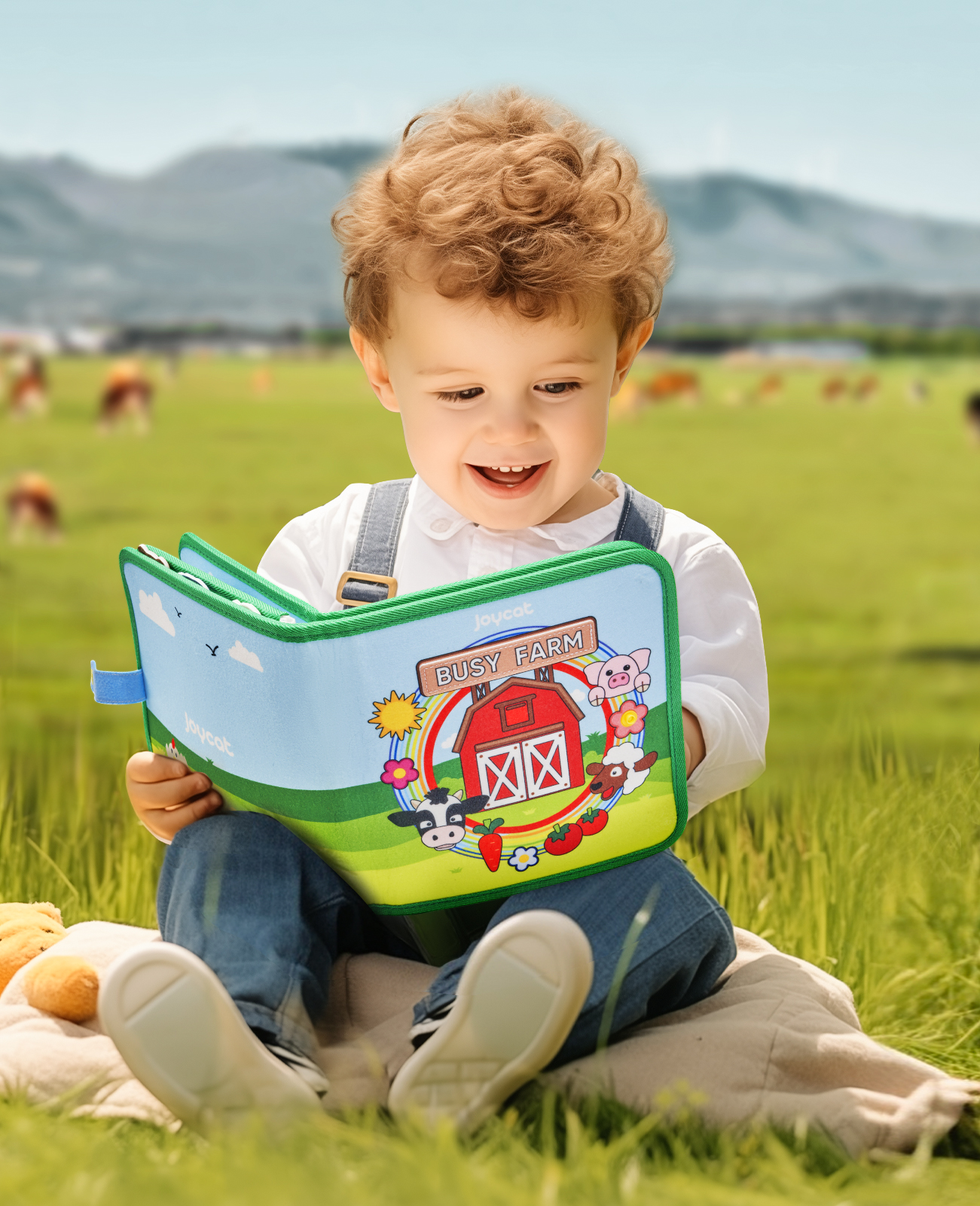 Farm-Themed Story Book: Beyond developing fine motor skills, the JoyCat farm-themed busy book introduces toddlers to the world of farm life. Through activities like feeding animals, picking crops, and operating the tractor to carry grain, children learn about animals and plants. Interactive elements, such as finger puppets, engage sensory and cognitive development, making this a fun and educational tool for both solo and group play. The quiet design provides comfort to parents, as it keeps kids entertained without noise or screens