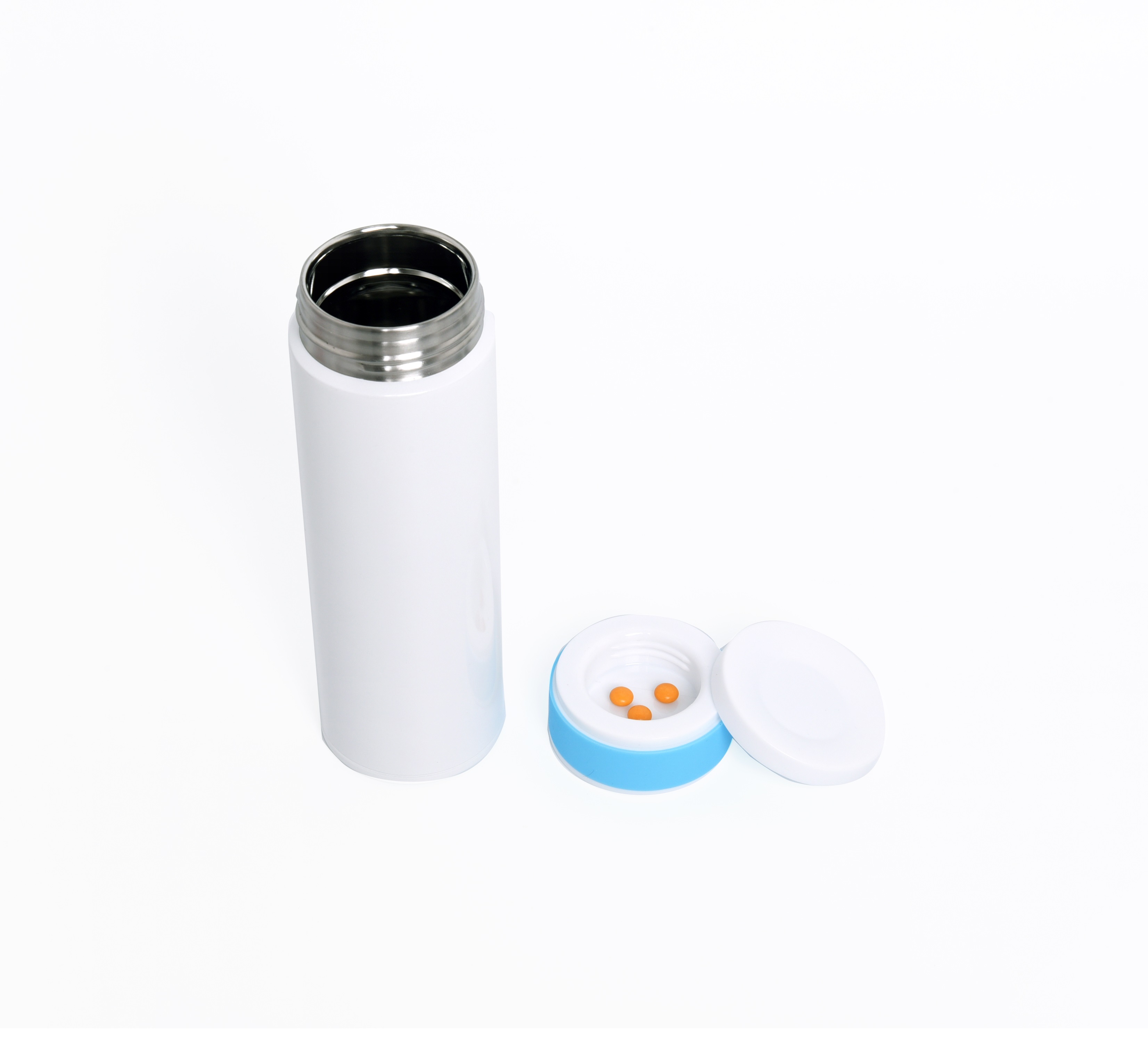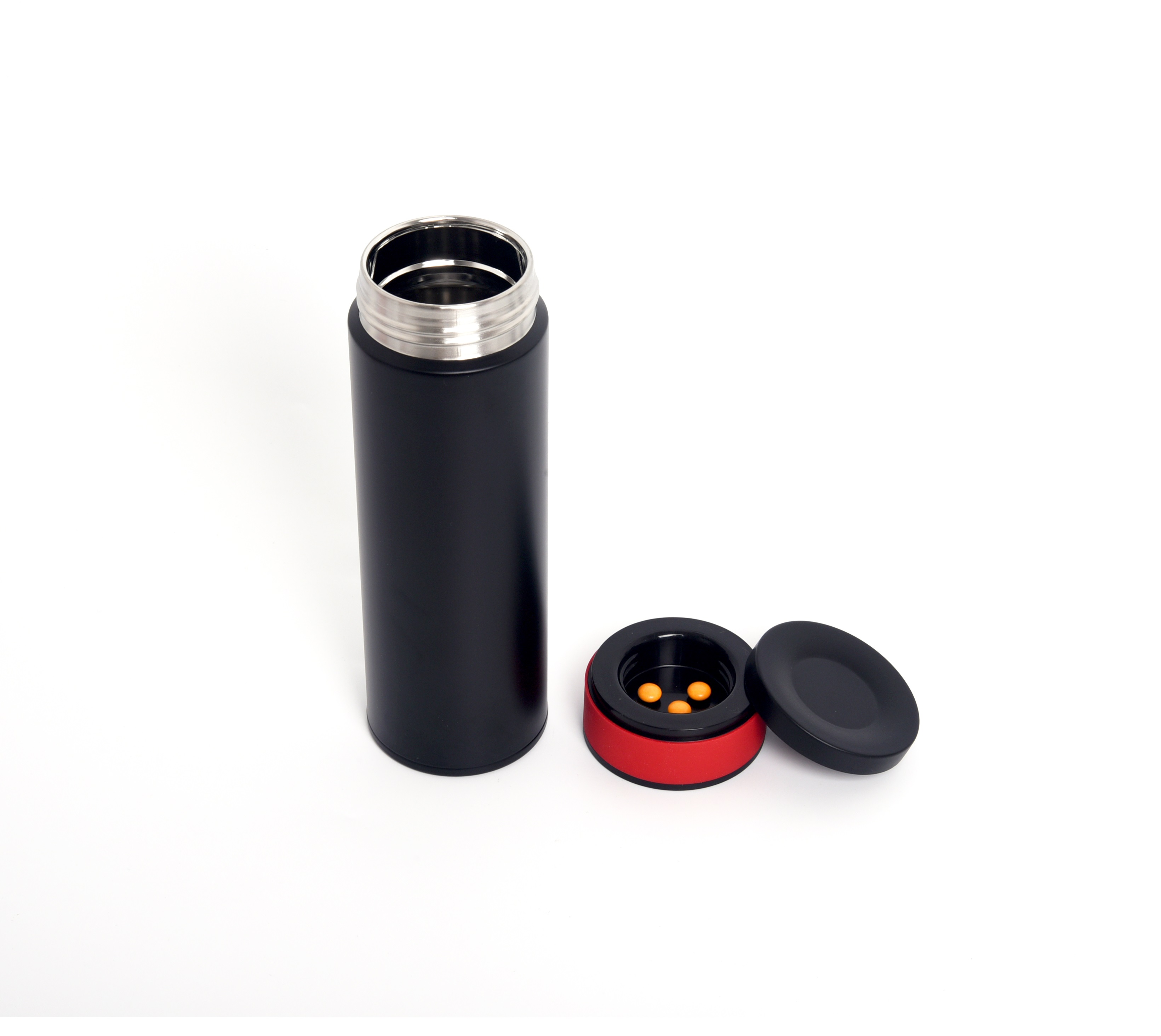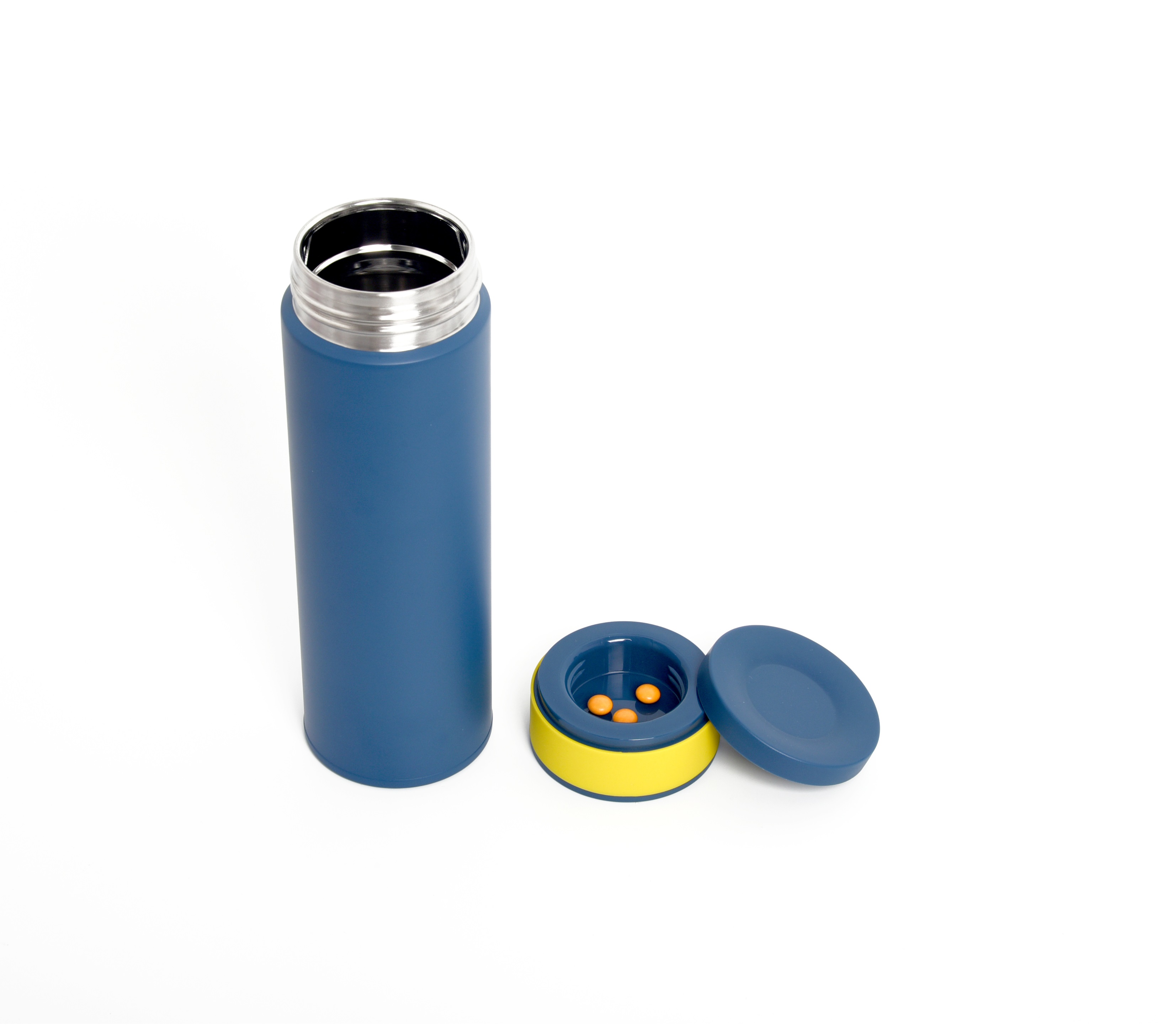 Smart storage of pills or teabags in interlayer of lid. Laser welding cup shows no visible sign of seams.
