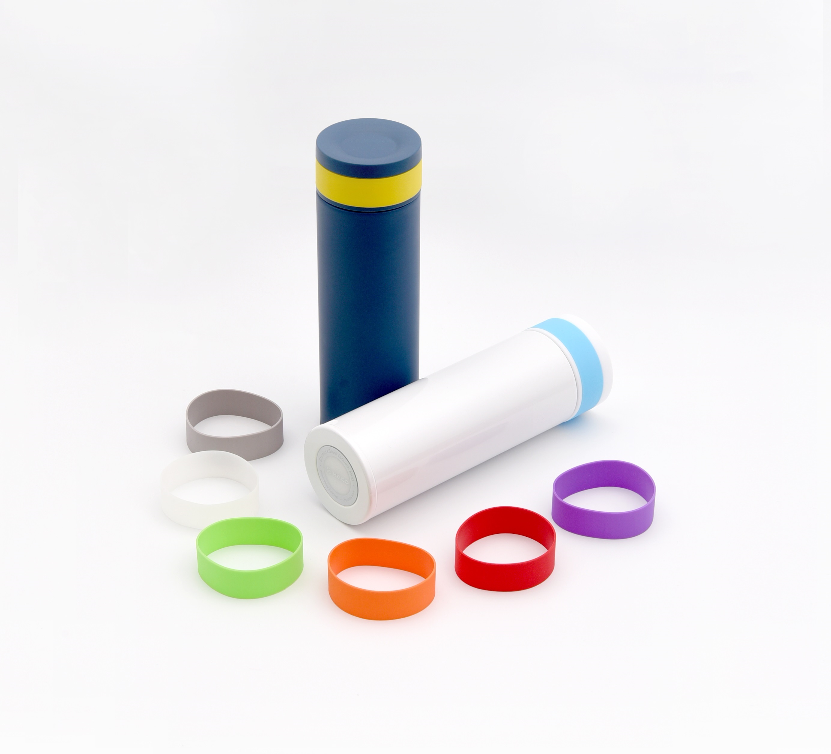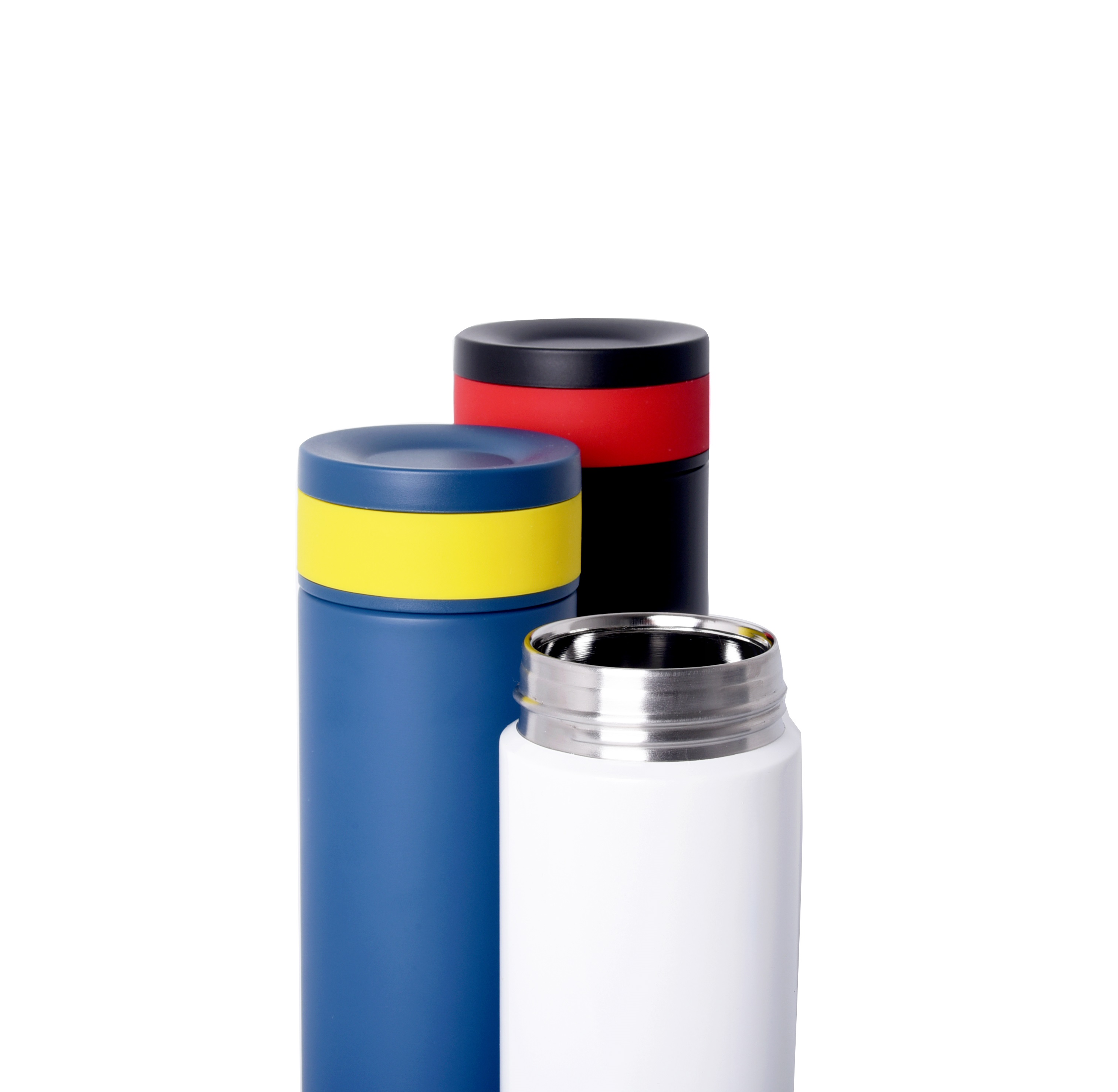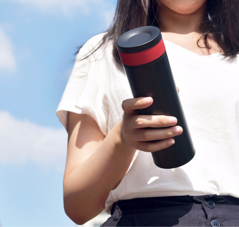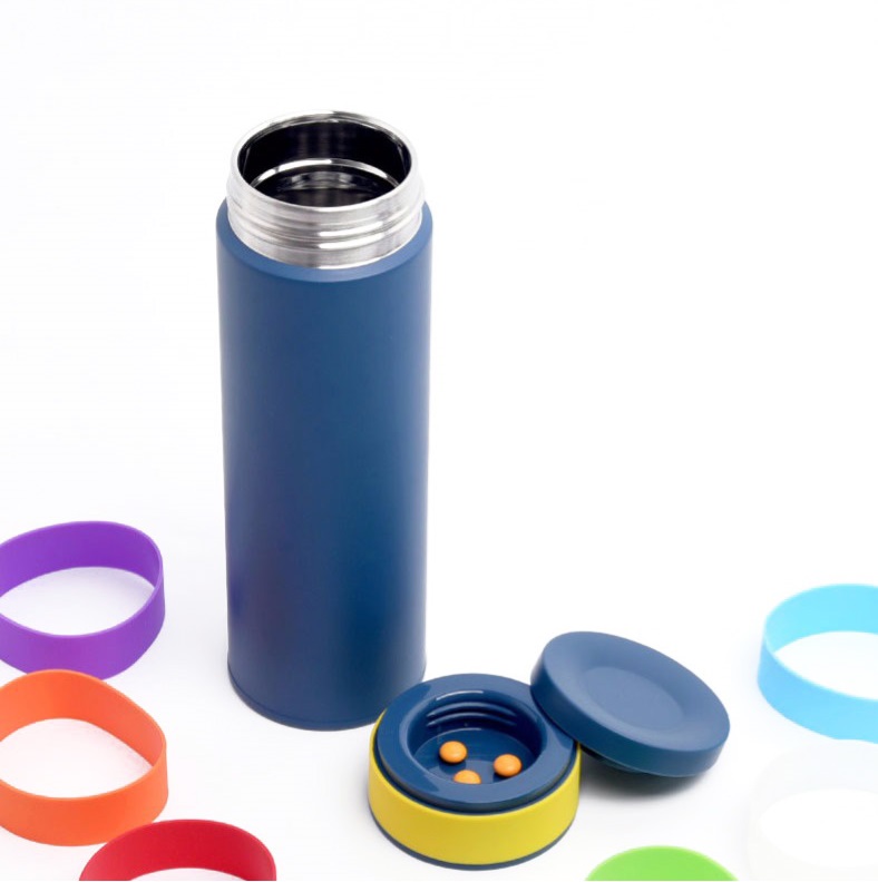 Smart storage of pills or teabags in interlayer of lid. Laser welding cup shows no visible sign of seams.