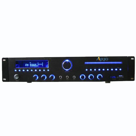The karaoke player is equipped with 2 built-in 60W (RMS) amplifiers. With an additional memory card reader and a USB port, this player can play various media files from USB flash drives and SD memory cards. The blue-light design makes it an elegant and stylish addition to your home theater equipment.