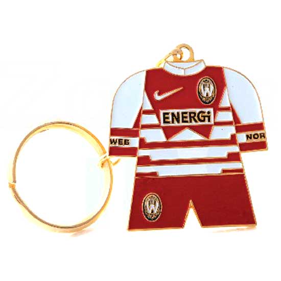 The metal key chain features a soccer player uniform with fine details. The polished gold-tone rim offers a sleek touch. This metal key chain is a great gift for football fans.