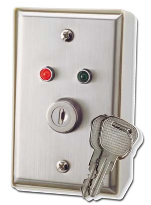 - Remote key station with latched or momentary dry contact for security system on/off control.