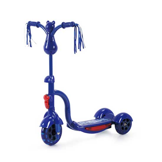This is a scooter bike in sea blue designed for kids. The handles are accented with tassels for added refinement. The three-wheel design ensures enhanced stability.