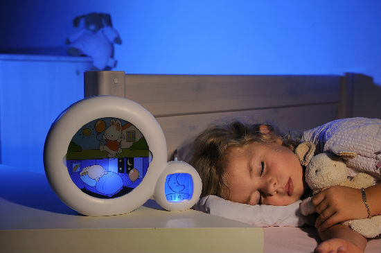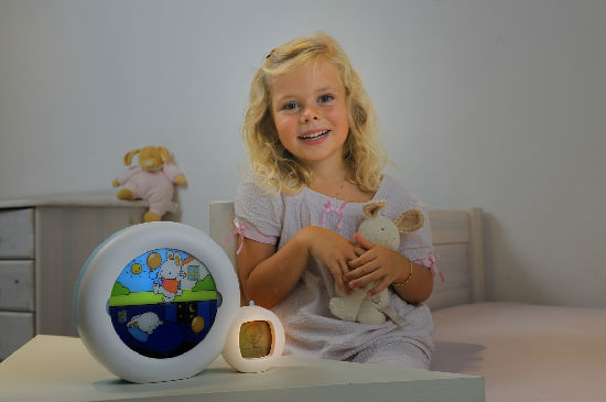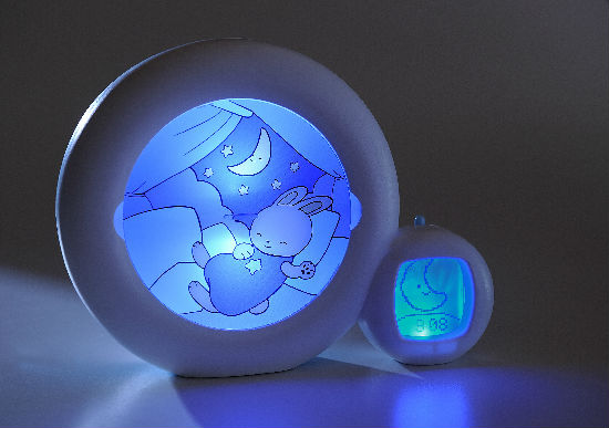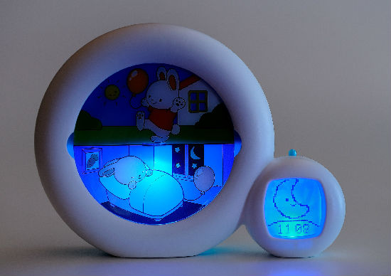 If the sleeping character’s picture and the moon are lit, stay in bed and sleep awhile longer ! At the time chosen by parents, the sun rises and the sleeping character is lit, it is okay to get up!