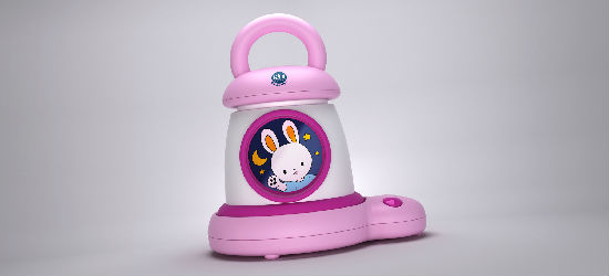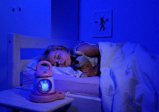 Very easy to use for the little ones thanks to its magic handle! By simply pushing the magic handle, different lights appear at each push : nightlight (only the “bunny” display lights up), white light, yellow light, blue light, red light, and also automatic change from one colour to another.