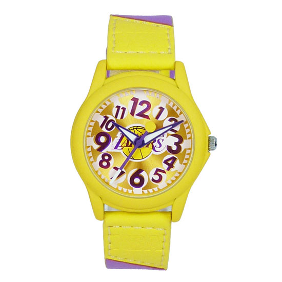 This wristwatch is designed with a Lakers theme to please kids who love basketball. It shows off a yellow-and-purple color scheme of the Los Angeles Lakers. This wristwatch boasts a round analog dial complemented with a leather watch strap.