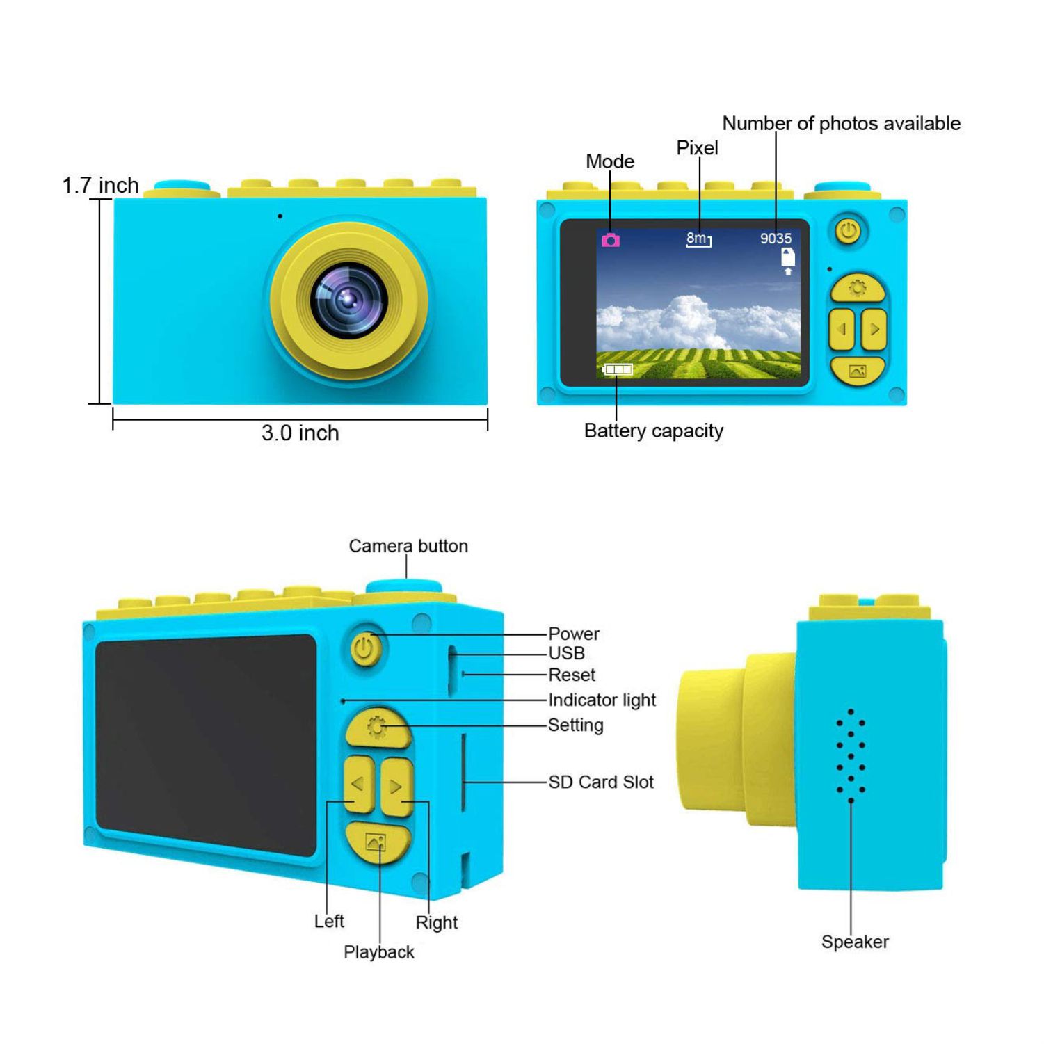 • 1080P HD digital children camcorders: easy to use. Supports photography and video with the ability to replay and delete both; 8.0 Mega pixels camera(3264 x 2448); video resolution:1920x1080p(30fps); 2-inch high-definition color screen, kids can check what they are filming and playback immediately. Or connect to your computer to download all of child's creations (include micro USB cable) video has timestamp (picture not available). record the growth of children.