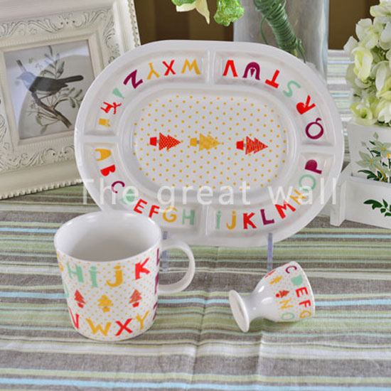 This is a kids' dinnerware set printed with colorful alphabets in bright colors. The set comes with a plate, a tumbler and a mug. Each piece is made of food-grade porcelain with excellent workmanship.