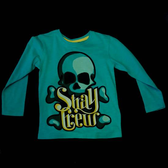The kids' T-shirt features a round neck and a pair of long sleeves. The T-shirt comes in a vibrant green color with eye-catching a skull print on the front. This T-shirt surely is a great item to enhance your kids' fashion ensemble.