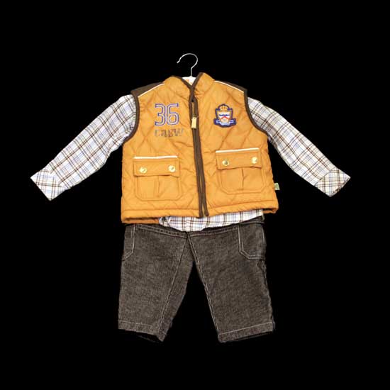 Displayed is a kids' outfit set that comes in three pieces, including a shirt, vest and pants. The vest features a pleasant orange color while the shirt is designed in a plaid pattern for a stylish touch. This kids' outfit set is made of 100% cotton for your kids' maximized comfort.