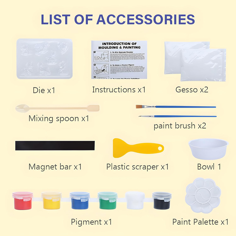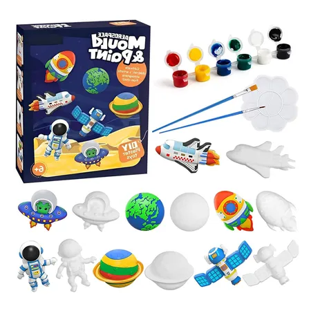 【FUN DIY PAINTING】: Enjoy the fun of painting! The painting craft kit includes 2 packs of plaster powder, modeling tools, 6 paint pots, 1 palette, 1 mixing bowl, 2 brushes, matching tools, 1 magnet set and an instruction booklet. Rich painting accessories to keep them away from electronic devices while painting. Suitable for parent-child interaction and classroom activities to improve children's cooperation and social skills, perfect for children's activities and parent-child interaction. 【SAFETY AND QUALITY】: water-based non-toxic painting and high quality plaster figurines make it safe and clean for babies and children. Children can mix and create according to their favorite colors, paint any color they want on the plaster statue, mobilize their imagination and show their talent in the painting game. This children's arts and crafts set is sure to keep your boys and girls entertained for hours. 【FUN AND EDUCATIONAL TOYS】: Ready to make your own figurines? This plaster set will meet all your child's needs, providing plenty of painting practice and creative fun, improving creativity, attention and imagination, and developing hand-eye coordination and color perception. These figurines include the earth, satellite, rocket and space shuttle. Come and let your child enjoy learning to combine colors! 【GREAT FUN FOR YOUR CHILD】: Enjoy a sense of accomplishment and artistic beauty by creating works that can be attached to the refrigerator with magnetic stickers or double taped to the bed, living room, bedroom and other places. The plaster toy painting kit includes four series, outer space, desserts, dinosaurs and animals. Children can simulate four different scenes, choose their favorite patterns, mix their favorite colors and create their own fairy tale world. 【THE BEST HANDMADE PAINTING GIFTS】: painting gifts for children's parties, art activities, classroom craft supplies, kids naturally like to draw this is a very popular gift for them, a good choice for boys and girls aged 6-12 who like to show their craft and painting talents. There is also a beautiful colorful box packaging is the perfect gift for children's day, Easter, Christmas, Halloween, birthday or any other holiday, the best painting toy set.
