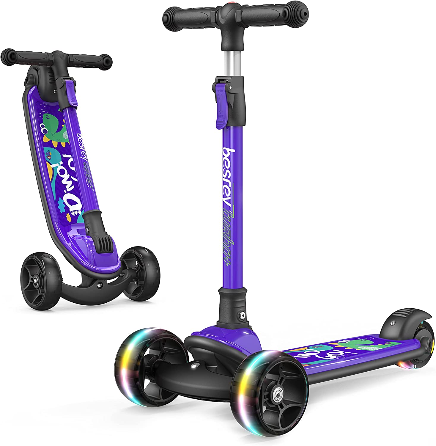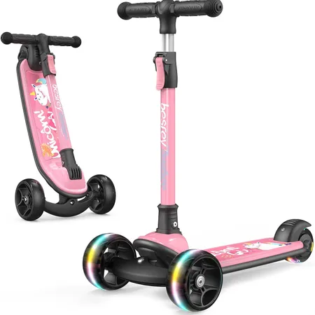 The toddler scooter features two big fronts LED wheels and small rear LED wheels, which are motion activated with no batteries required. Lights get brighter the faster your kids go. The bright and eye-catching design keeps children safe and fun in the dark. Highly sensitive rear brake, stop when stepped on.