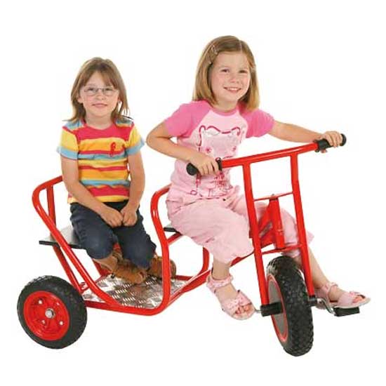 The tricycle is specially designed for kindergarten and pre-school kids. It features a two-seat design for children to enjoy riding fun. Made of high-quality metal, this tricycle boasts robust construction for long-lasting use.