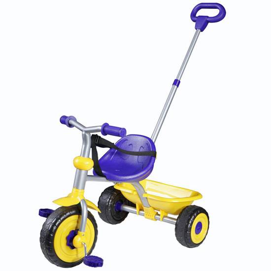 This kids' trike comes in sharp blue and yellow colors. It features a sturdy steel frame, blow-molded tires with rubber tread strips for extra gripping. The rear storage bin is for storing your kid's favorite toys.