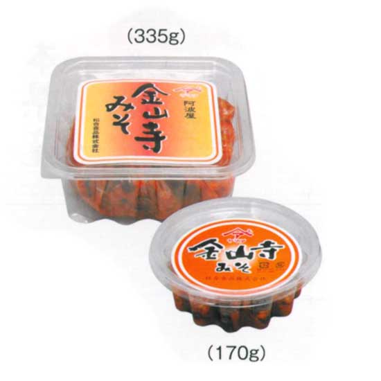 Displayed is Kinzanji miso that comes in a seaweed flavor. With a special recipe, this miso stimulates the appetite. This miso is also a healthy choice as it is low in calorie and high in protein.