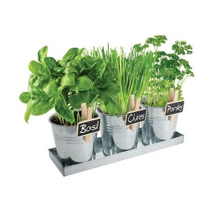 A great alternative to our square pot kit, our new round pot kit offers superb value for money. This kitchen herb kit includes 3 round galvanized pots and a tray, basil, chives and parsley seeds, starting soil, instructions, growing tips and 3 extra wooden tags with slates. This charming herb kit is ideal for your household.