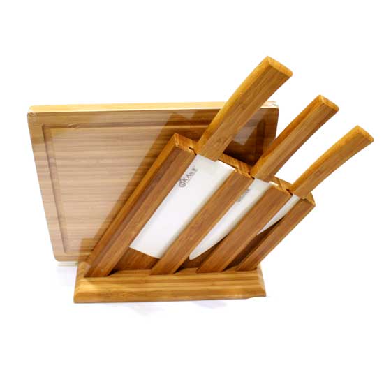 Shown here is a kitchen set comprising three knives. It comes with a bamboo knife holder and chopping board. The modern design makes it stand above the rest.