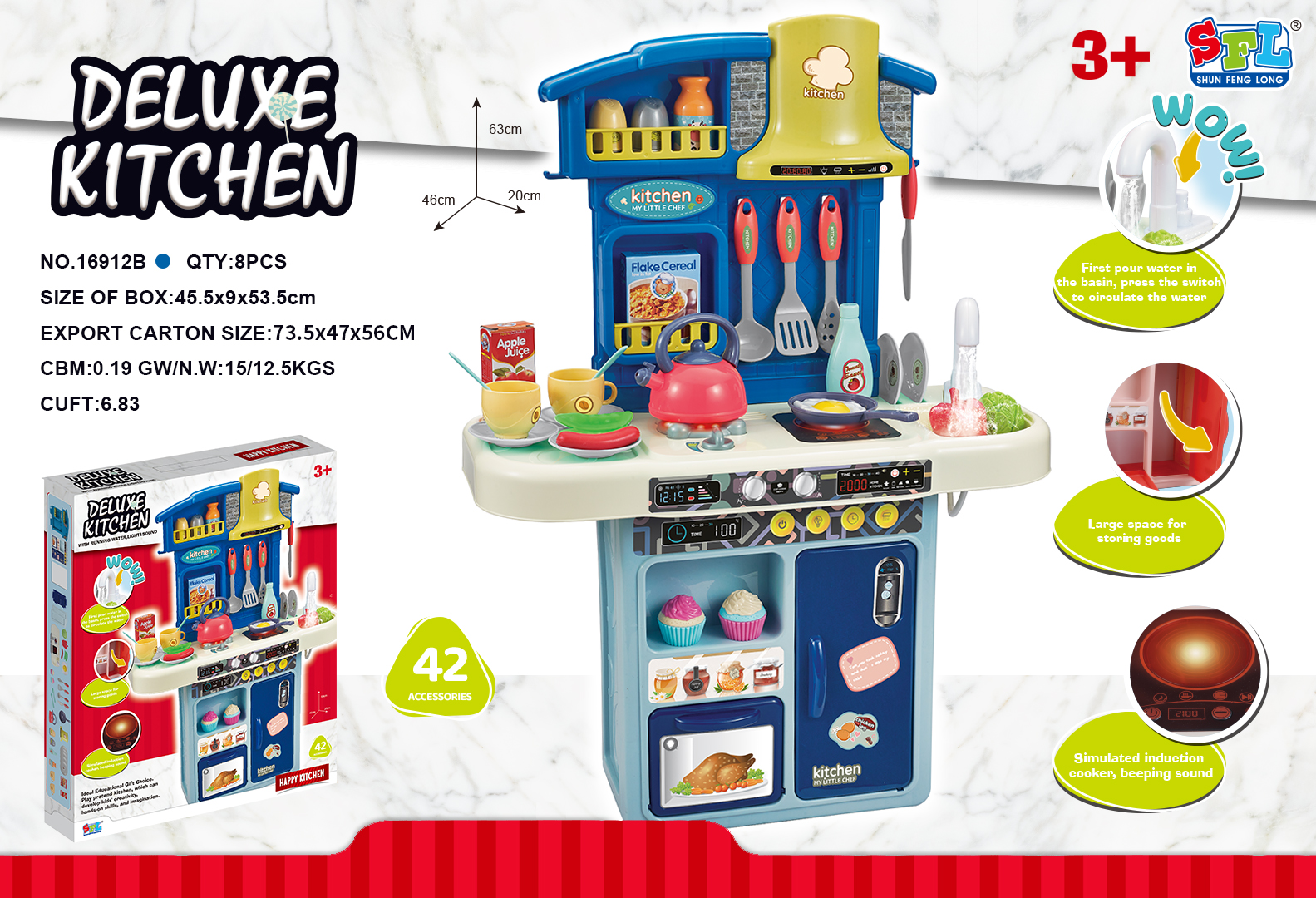 A set of Multi-Function Spraying Kitchen.This kitchen play set will encourage role playing and is a great toy for developing hand/eye coordination.It contains a simulated kitchen, dinnerware,pan, hamburger,cake and vegetables etc.The faucet can press water out.Drip to the spray hole then open the key, stove have real vapour.Realistic spray effect makes cooking more vivid.Kitchen can simulate real cooking sound.When the switch is turned on, the stove will emit red light with smoke effect to meet the children's needs.It also has push-pull type storage cabinet.Suitable for children to invite friends to play the game together and simulate cooking in the kitchen like boiling water in a kettle or washing vegetable and dishes.Stylish design and excellent quality.Let children grow up happy to autonomous learning.Give your little child more fun to develop hands-on ability and imagination.