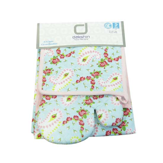 This graceful kitchen textile set grabs your attention with its allover floral printings. It is fabricated from cotton for a cozy touch. This quality kitchen set is a practical addition to your home.