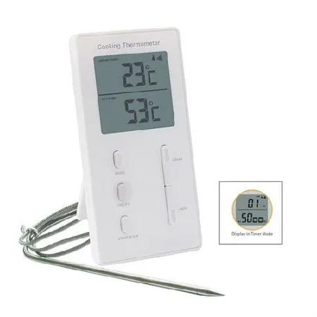 This digital kitchen thermometer features a presettable temperature alarm and a timer. It has an stainless steel extended sensor probe which can be used in oven directly. The thermometer is built of strong material with a robust construction. Main features include: