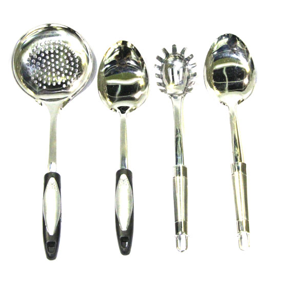 This kitchen tool set consists of four tools for different uses in the kitchen, including a pasta server and a skimmer. The plastic handles ensure easy gripping with safety. Made with durable stainless steel, this kitchen tool set is a wonderful companion to you in the kitchen.