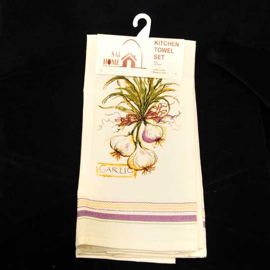 The kitchen towel set comes in a 2-piece design. It features a garlic pattern for a decorative touch. This towel is made of 100% cotton to give a soft and easy-to-wash texture.