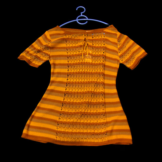This striped ladies' blouse is designed with fancy knit patterns. It comes with a boat neckline with a small knotted string. This comfy blouse is an adorable garment for a casual day.