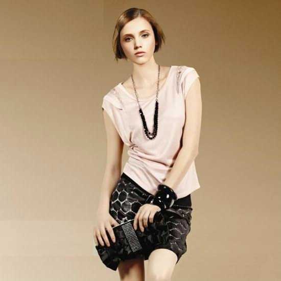 This is a knitted blouse that is made of 70% cotton and 30% nylon material. It is designed with a classic round neckline and short sleeves. This knitted blouse offers a soft and comfortable touch.