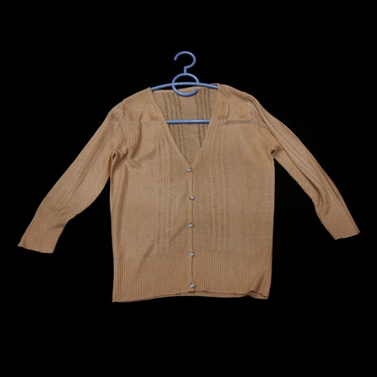 This cream-color cardigan features a V-neck front with sparkling buttons. Fine textured stripes add sophistication to this garment. This mid sleeve cardigan is a light and comfortable choice for everyday occasions.