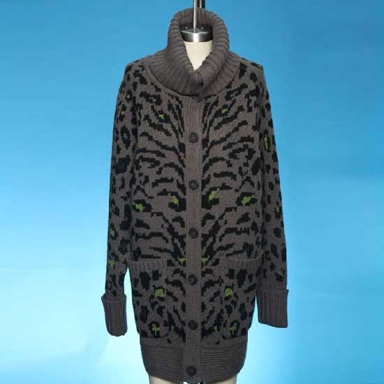 The pictured acrylic cardigan comes in a charcoal gray hue. It features a turtleneck, 2 side pockets and a button-front closure. The leopard-print details add a wild yet chic accent to the cardigan.
