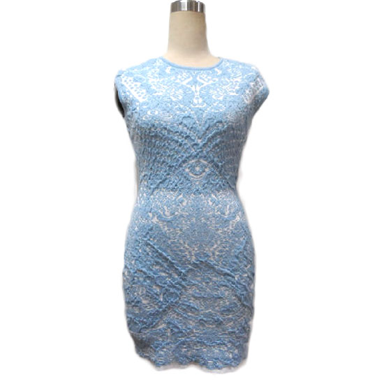 This is a ladies' knitted dress with a chic appearance. It comes in bright blue with sophisticated patterns. This dress is made with excellent workmanship and attention to detail.