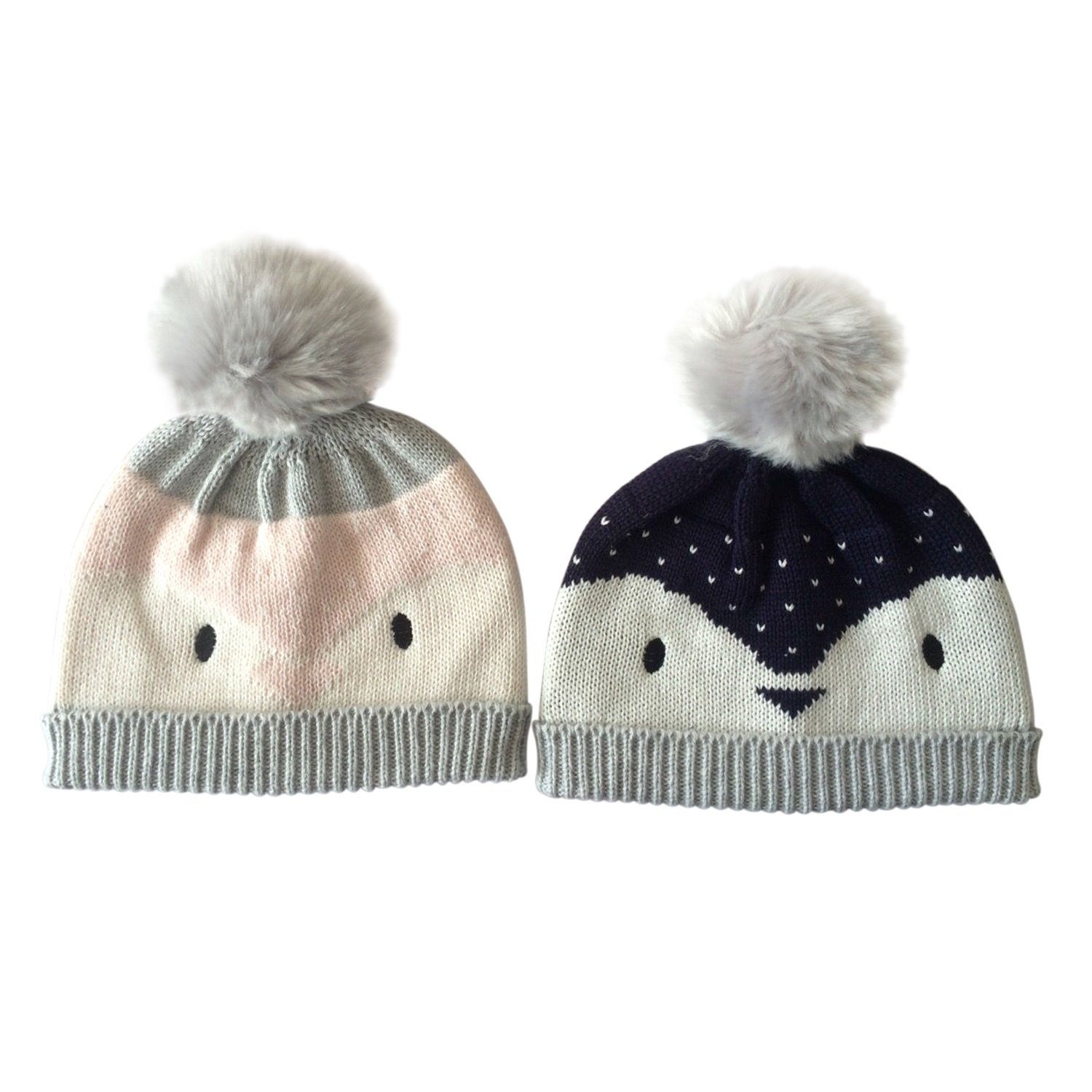 100% Cotton jacquard hat w fake fur pom & full fleece lining