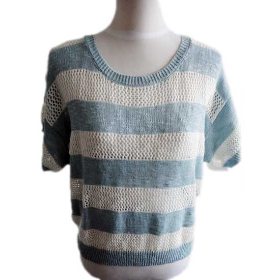 This knitted ladies' sweater features blue and white strip patterns. The classy sweater is designed with a scoop neck and short sleeves. The stylish sweater is perfect for creating a casual autumn look.