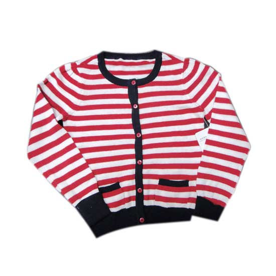 This striped knitted sweater is sure to keep the wearer warm on chilly days. The red and white stripes on the sweater are pleasing to the eye and accented in black along the collar, pockets and cuffs. This button-up knitted sweater would make a great addition to your wardrobe.