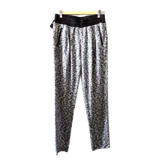 This is a pair of knitted trousers with a comfortable design. It comes in gray with white and black accents. This pair of trousers is completed with a black elastic waistline.