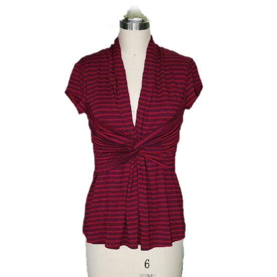This knitted tunic features a deep-V neckline and a twisted design in the middle to produce a curve-hugging silhouette. The allover red striped patterns jazz up the exterior with energetic flair. The alluring short-sleeved outfit is finished with a ruched hem for added style.