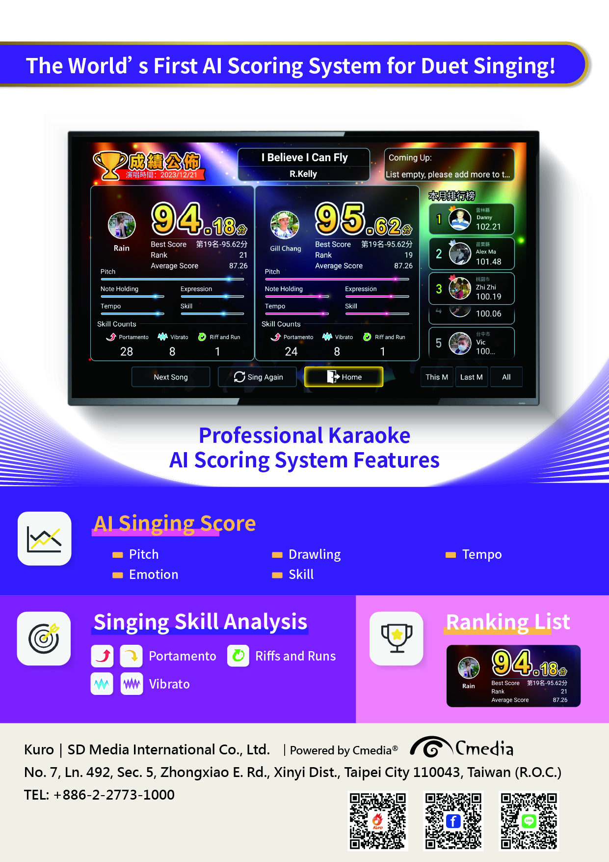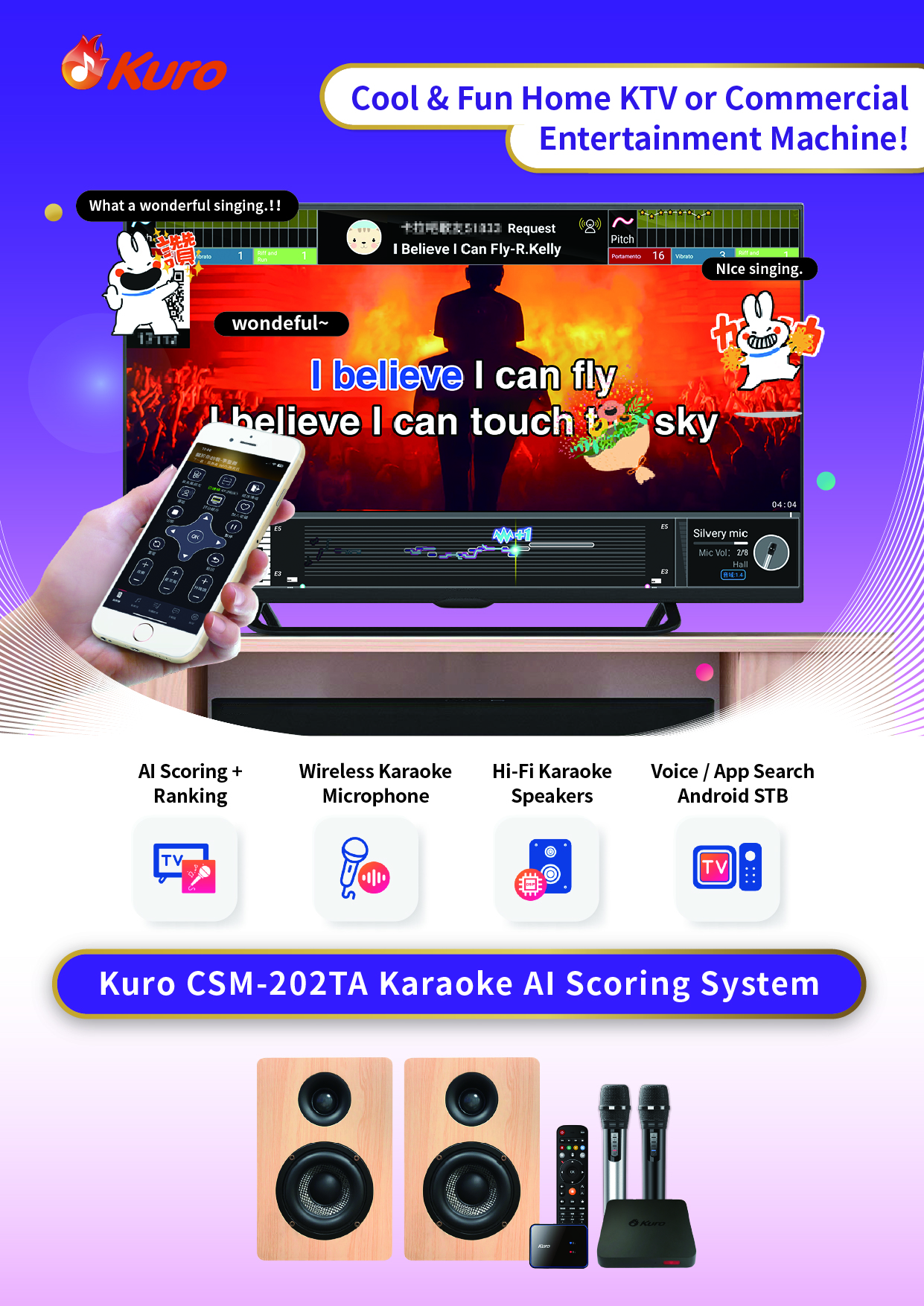 Kuro Karaoke AI Scoring System is the world's first home KTV system with duet AI scoring. It instantly evaluates pitch, rhythm, singing techniques and provides national leaderboards, which makes karaoke more fun and rewarding. With cloud-updated song libraries, voice and mobile app song selection, bullet comments, auto vocal guide, and even duet singing with original artists, it's easy to use, refreshing, and redefines the home entertainment of a new era.