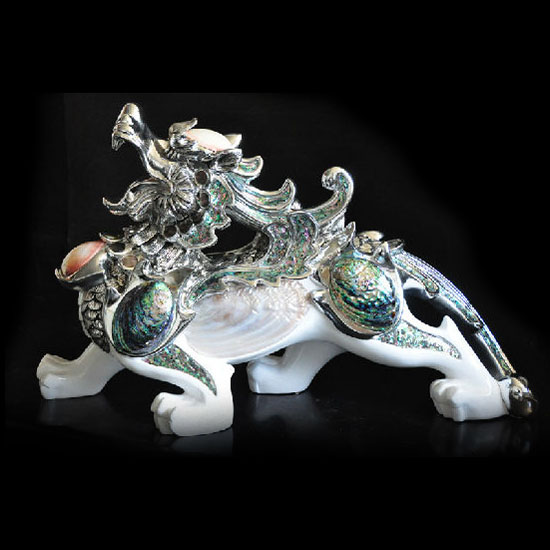 This is a home decoration with a sophisticated and unique kylin appearance which has a Chinese name “Qilin”. It comes with a white body with colorful accents. The kylin is a good omen thought to occasion prosperity or serenity.