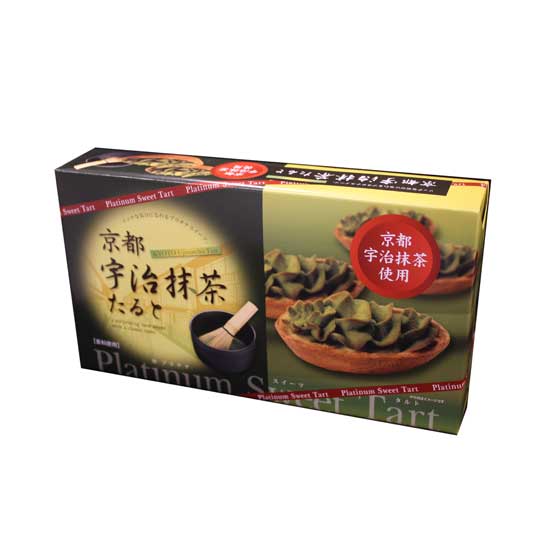 Displayed is a pack of Kyoto ujimatcha tart that comes in a beautiful packaging. Following a special recipe, this tart offers a surprising new sweet taste based on the classic matcha taste. With an attractive wavy top, this Kyoto ujimatcha tart is a good choice for snacks and gatherings.