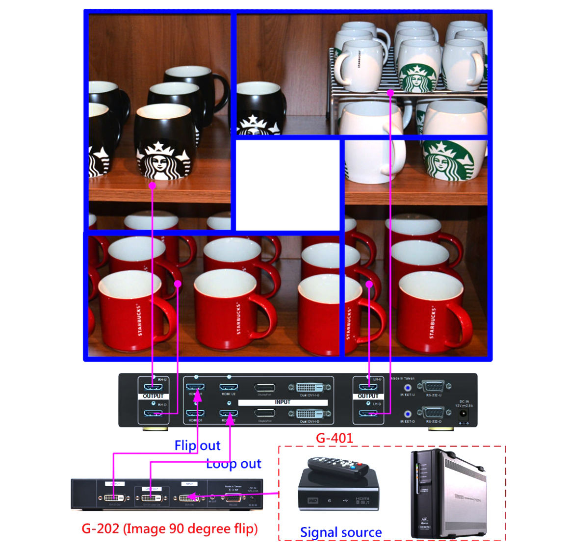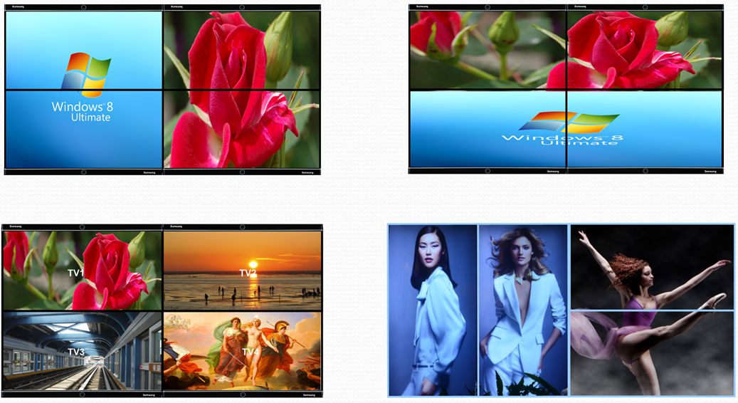 - Video wall with flexible display profile settings, for instance: switching among single/dual/triple/quad signal source displays, different aspect ratio content display without blanking borders.