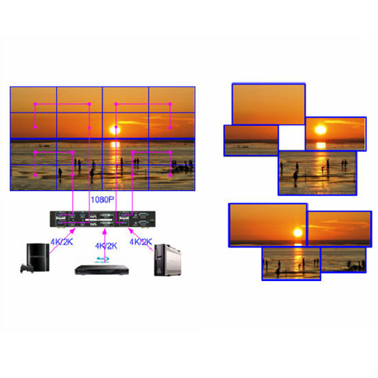 - Simplify high resolution video wall configuration. Single 4k/2k source is easy to apply for 4x4, 5x5, 6x6, 8x8… video wall system.