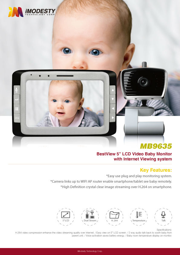 H.264 video compression enhance the video streaming quality over internet.Easy view on 5'LCD screen.2 way audio talk back to sooth baby from parent unit.Voice activation saves battery energy.Baby room temperature display on monitor.