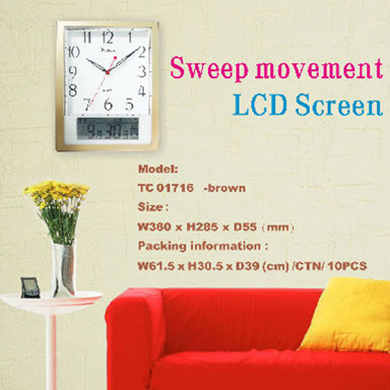 Shown here is a rectangular wall clock coming with an LCD display showcasing date and week. Luminous hands allow you to know time even in the dark. This burnished wall clock makes a great decoration to your room.