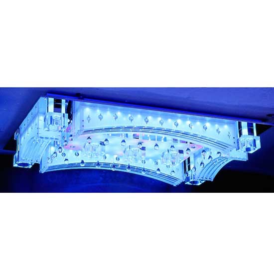 The LED ceiling lamp features a rectangular fixture with four arc-shaped lampshades on each edge. The dangling crystal ball decoration in the center shows off a decorative touch. This ceiling lamp is excellent for restaurants, dining rooms, hotels, etc.