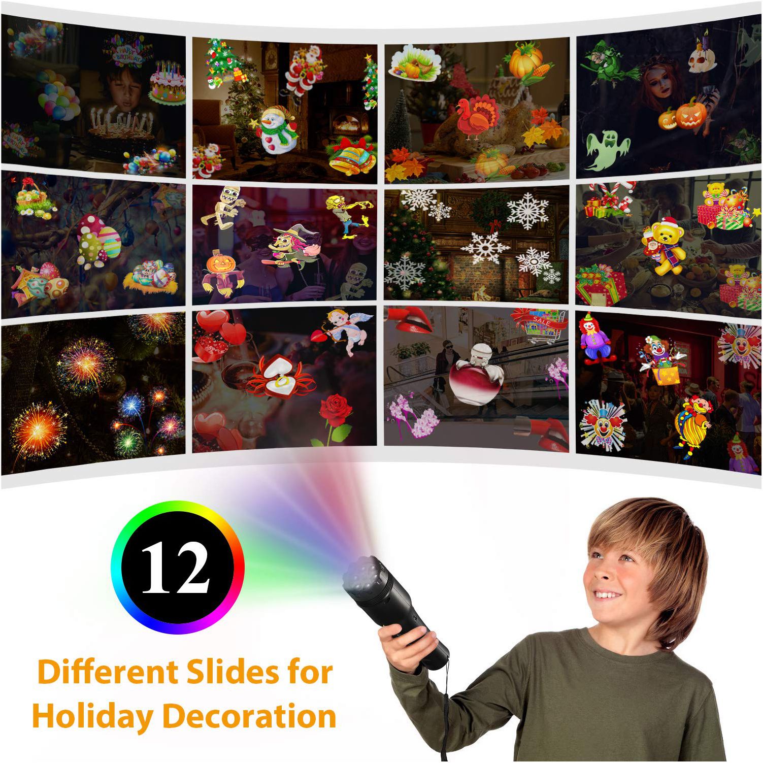 HOME PARTY LIGHTS: Battery or USB powered, the best on the go party supplies for adults and kids. Features 12 exclusive patterns slides, colorful light decoration, interchangeable images display, suitable for home party, Birthday, Christmas, Halloween and so on.